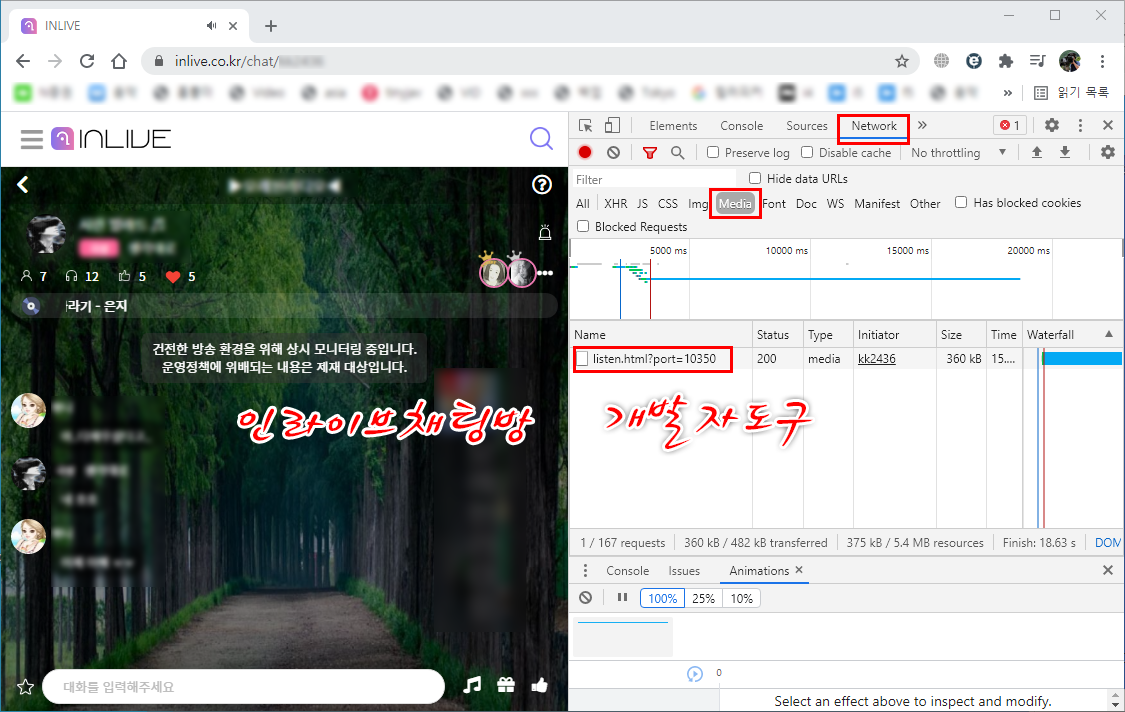 크롬(Chrome) 실행 -> Ctrl + Shift + i (개발자도구) 실행후 Network클릭 Meia클릭 -> 인라이브채팅방접속