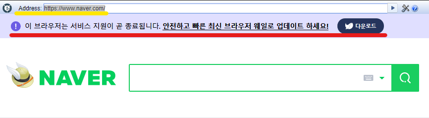 네이버는 안전성에 문제가 되는 IE 관련으로 지원을 일찍부터 축소해 왔기 때문에 IE Tab을 제대로 설치 했다면 바로 아래 이미지의 빨간줄이 쳐진 것과 같은 안내 메시지를 확인할 수 있다.