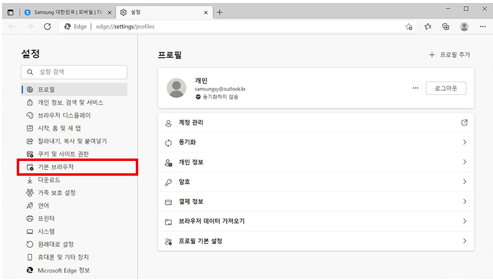 3. 좌측 설정 메뉴에서 [기본 브라우저]를 선택하세요.