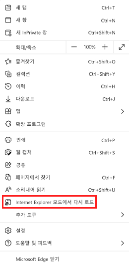 - Internet Explorer 모드에서 사이트를 다시 로드할 수 있도록 허용이 기본값으로 설정된 경우 사용자는 기존 Internet Explorer 11 사용량이 있는 경우 IE 모드로 사이트를 다시 로드할 수 있습니다.