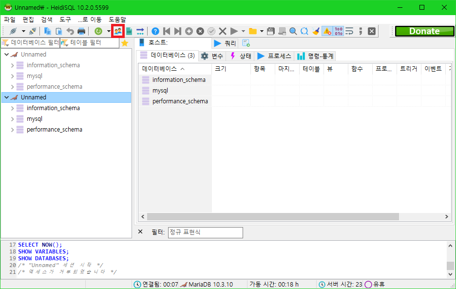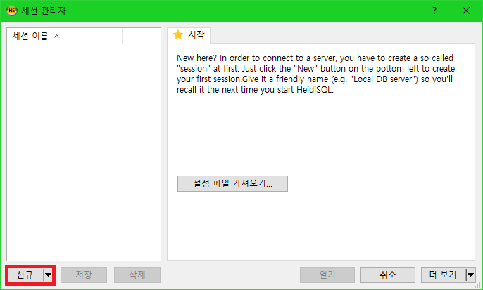 이제 PC 환경에서 다운받은 HeidiSQL을 실행해 봅시다. 다음과 같은 뭔가 허전한 창이 뜰 것입니다. 왼쪽 아래의 "신규" 버튼을 눌러줍시다.