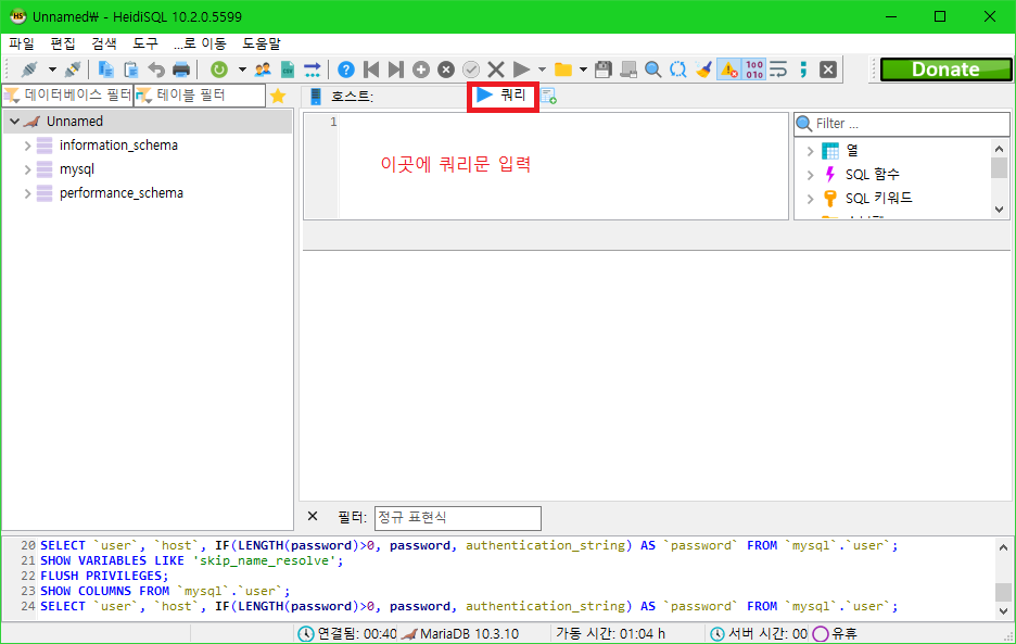계정 설정을 마쳤으면 사용자 관리자 창을 닫고 아래 스크린샷에 빨간색 네모로 강조한 쿼리 탭을 누릅니다. 이제, 쿼리문을 입력하여 DB를 관리할 수 있습니다(사실 계정 설정도 쿼리문을 통해 할 수 있긴 합니다).