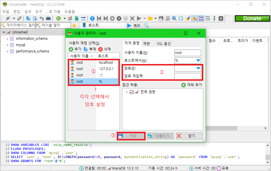 왼쪽의 사용자 목록에서 설정할 사용자를 선택할 수 있습니다. root 계정이 4개가 보이는데 위의 3개는 로컬호스트에서 접근할 때의 계정이고, 마지막 한개의 루트 계정이 외부에서 접근할 때의 계정입니다(PC에서 HeidiSQL을 통해 MariaDB Server의 루트 계정에 접속할때 이 마지막 계정의 암호를 입력해야 합니다).
