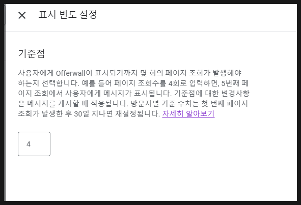 표시빈도를 0으로 입력해서 사이트에 오자마자 광고가 뜨게 할 수 있지만 잘 활용해야 할 것입니다.